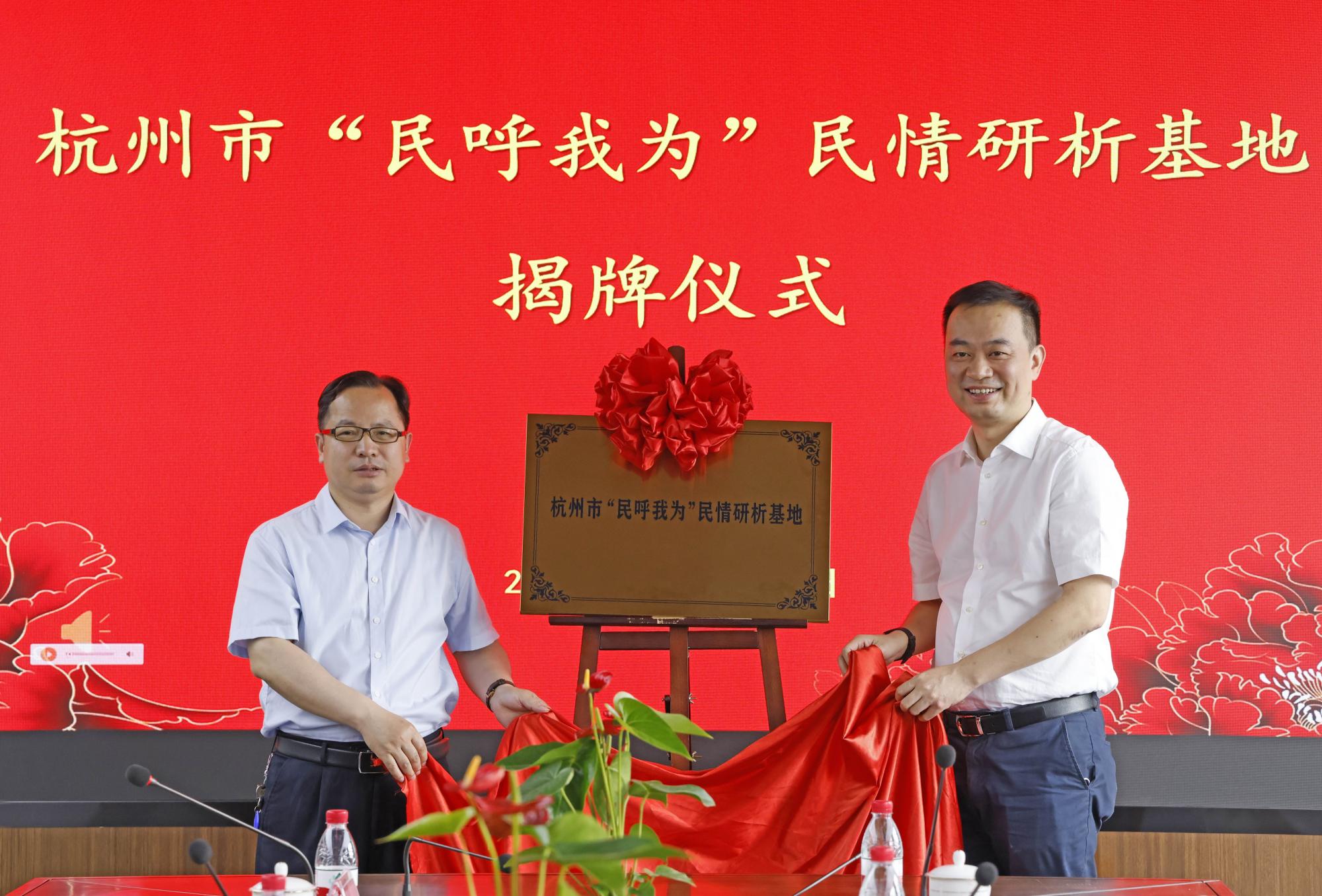 周徐胤和楼胆群共同为杭州市“民呼我为”民情研析基地揭牌。倪毅和中国政府管制研究院执行院长、“民呼我为”民情民意分析研究项目负责人倪建伟分别代表双方签订项目合作协议。