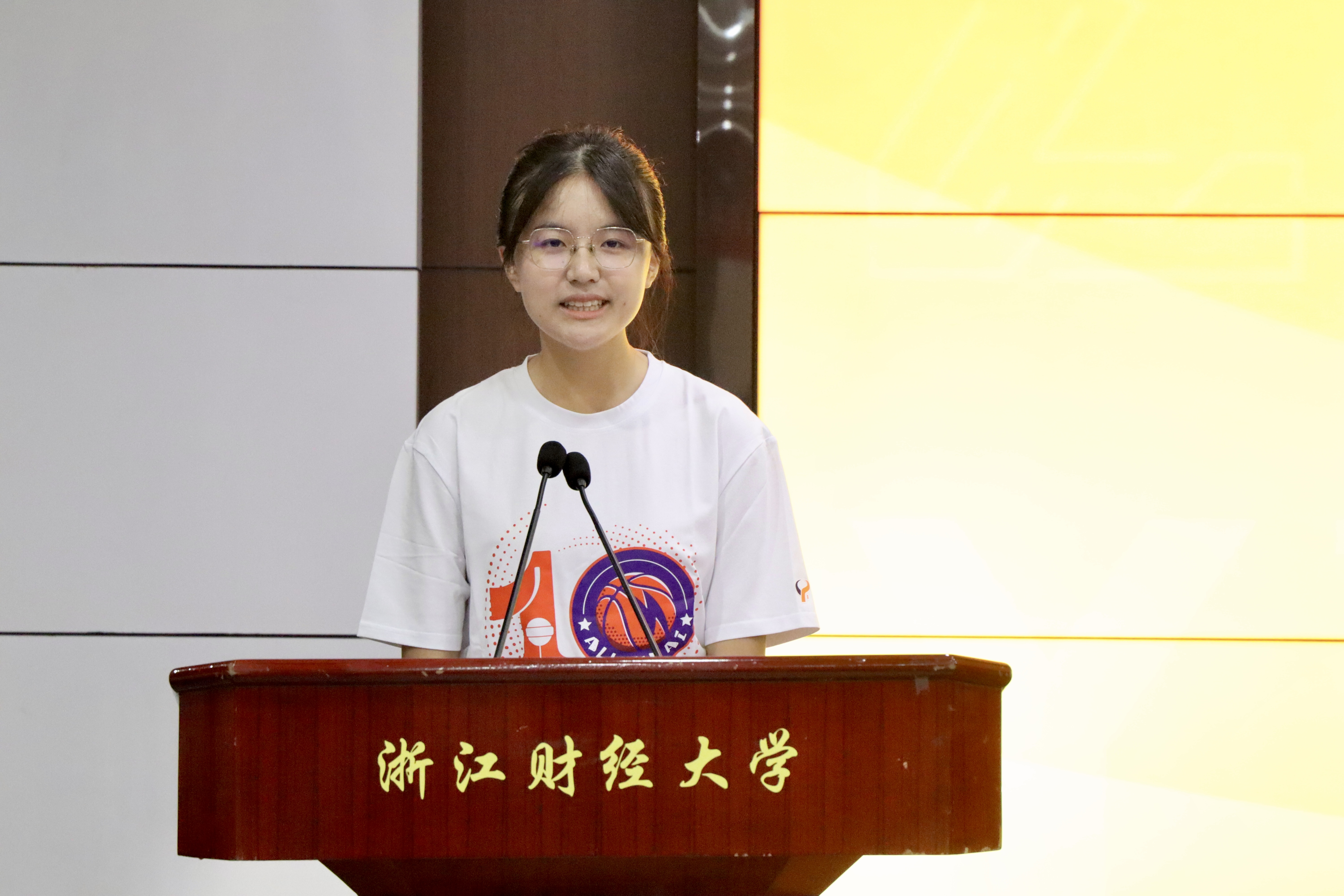 陈奕然同学代表2024级新生首先对老师与班导们的关心帮助表示感谢,并勉励同学们在大学生活中不断追求知识与梦想,勇敢面对新时代的挑战。她特别强调了“进德修业,与时偕行”的校训,希望与同学们共同在学术和品德修养上不断进取,并通过科技与金融的融合推动社会进步。“愿君希羽翼,一化北冥鱼。愿我们不忘初心,砥砺前行,怀揣智慧与勇气,走向更广阔的世界!”