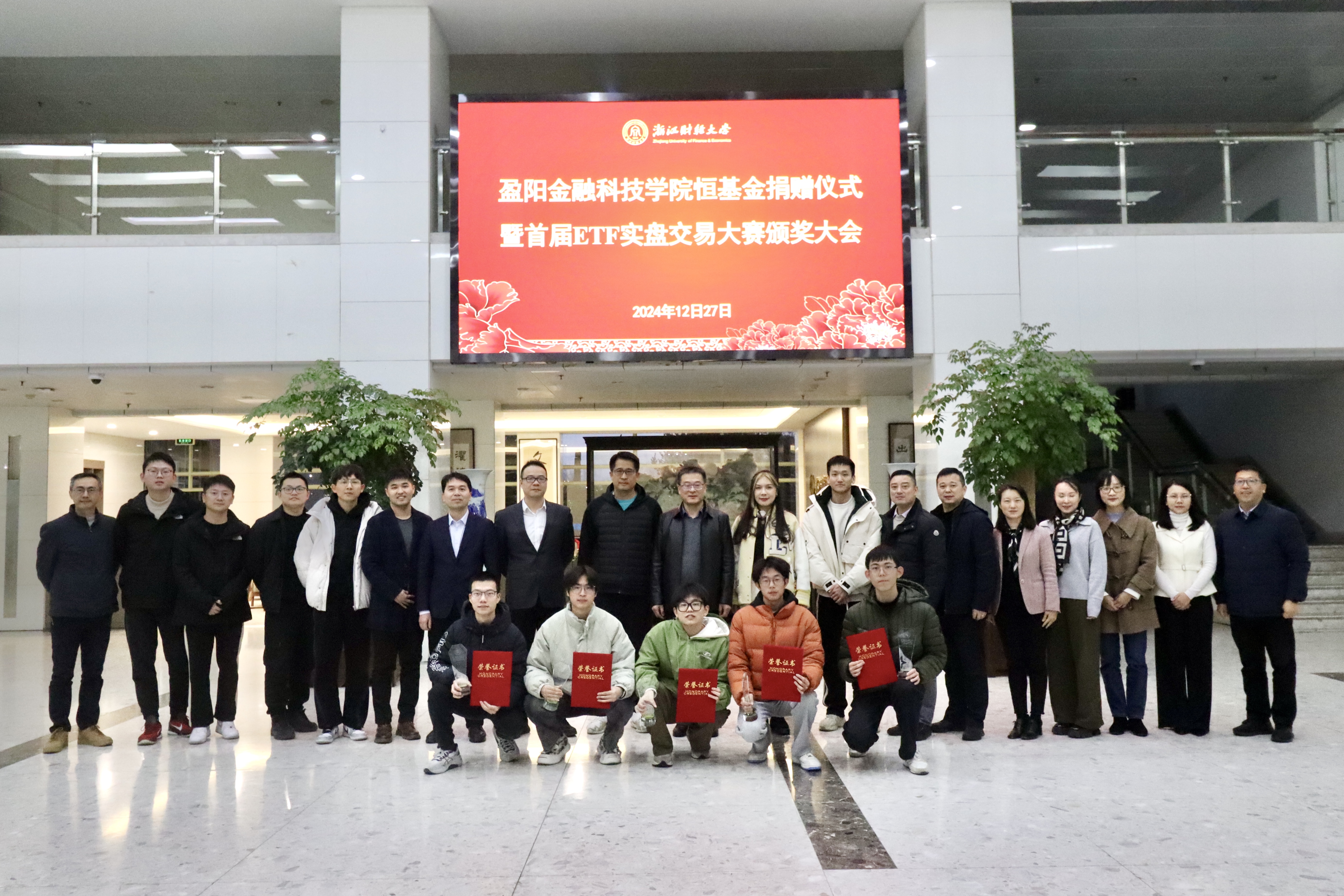 杨剑勇、陈浙平为获三等奖获得者陈舜益同学、徐心阳同学、刘渝畅同学颁奖(收益率分别为7.18%、5.67%、4.70%)。