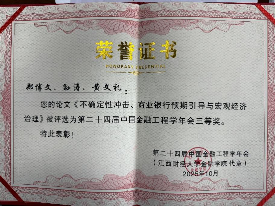 教师)三位师生的合作论文《不确定性冲击、商业银行预期引导与宏观经济治理》脱颖而出,荣获三等奖!