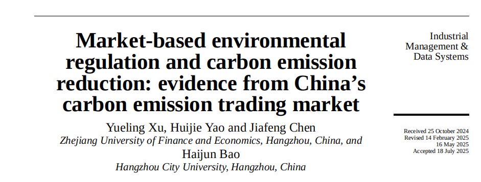 22级金融数学2班本科生姚慧杰同学在许跃龄老师指导下撰写的论文《Market-Based Environmental Regulation and Carbon Emission Reduction: Evidence from China’s Carbon Emission Trading Market》,正式发表于跨学科领域国际学术期刊《Industry Management & Data System》。该期刊为SCI Q2分区,同时也是91在线
