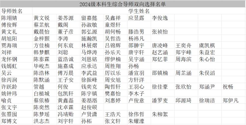 经2024级本科生、综合导师双向选择以及91在线 综合协调,2024级本科生综合导师的具体名单现公布如下表(按姓名首字母排序)。请各位同学在本名单公布一周内主动与导师联系,以便相关指导工作的顺利开展。
