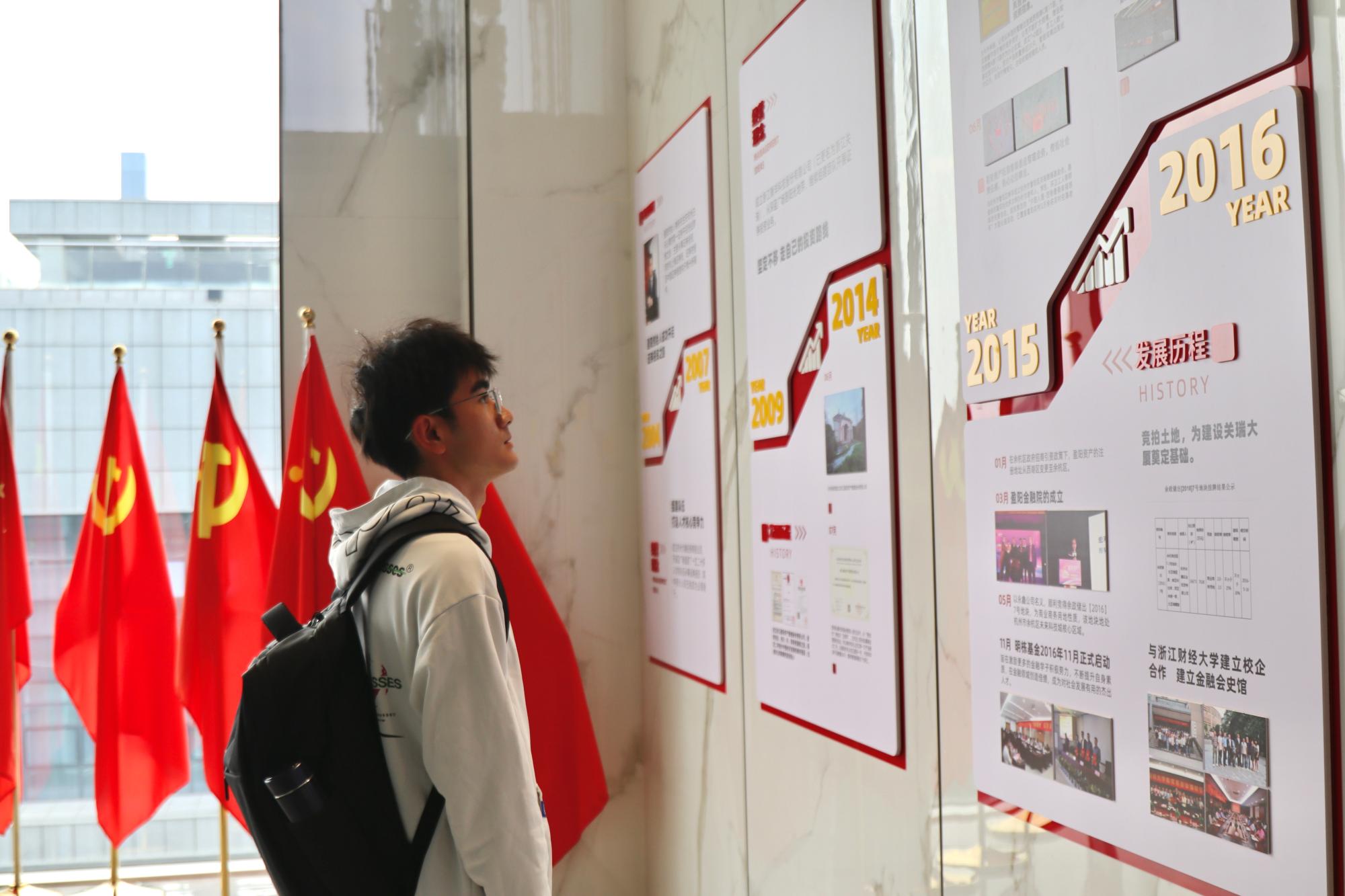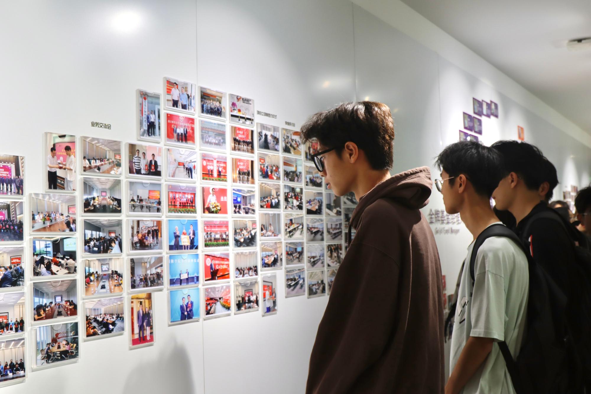 同学们在公司历程墙和荣誉墙前见证了公司的发展历史,在照片墙前充分感受极富活力的91在线。